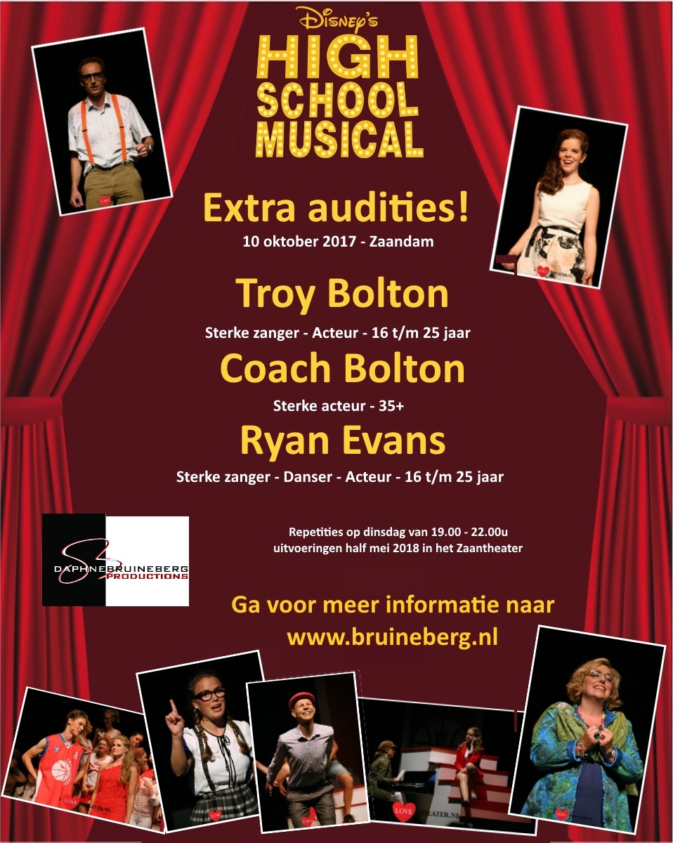 De cast van High School Musical (Zaandam) is bijna compleet. Sta jij binnenkort met deze kanjers te shinen in het Zaantheater? Wil je in een amateur voorstelling staan met een professionele aanpak? Je werkt dan o.a. met Daphne Bruineberg (Producent), Rosite van der Wouden (o.a. Stage entertainment) en Bernadette Dengler (o.a. Stage entertainment)