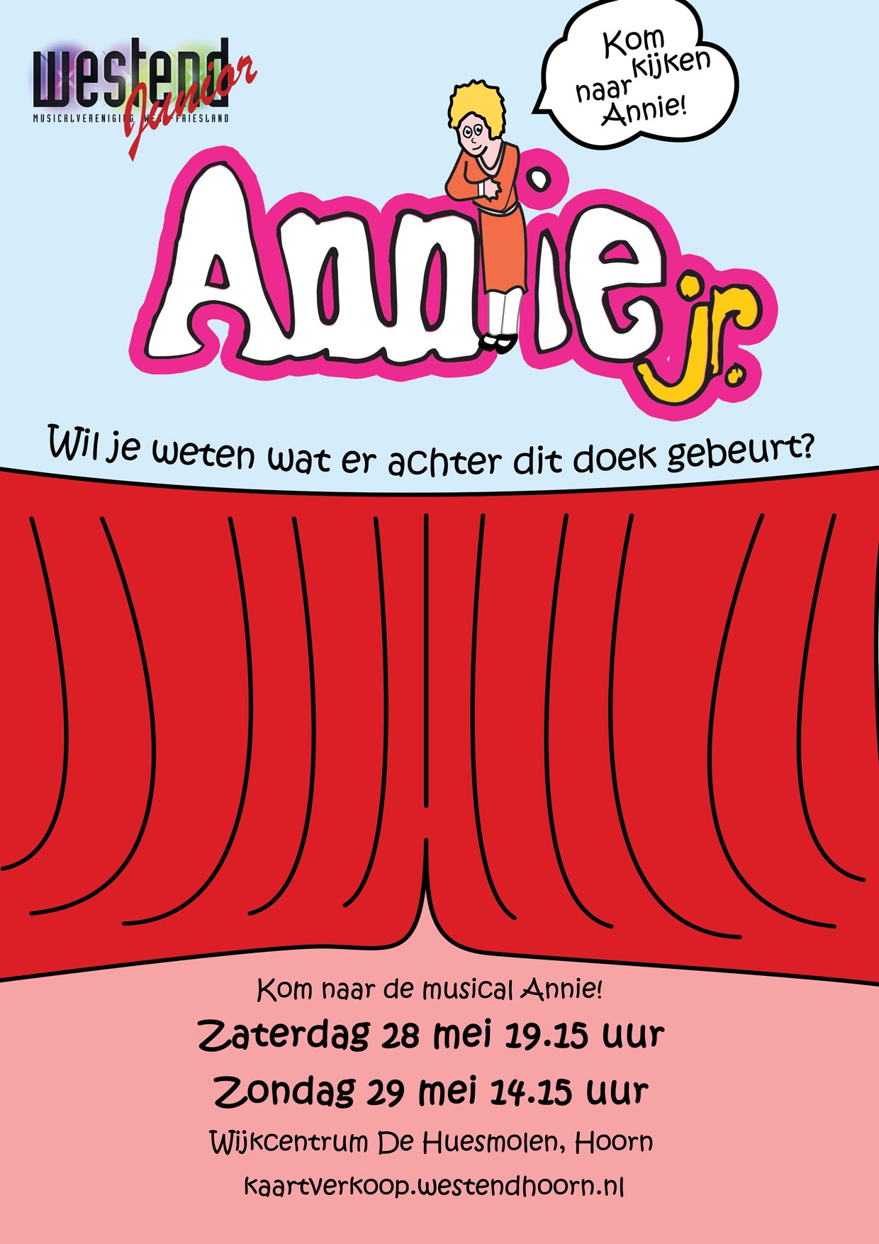Musical Annie van Westend Junior. Op 28 mei (19.15 uur) en 29 mei (14.15 uur) in Wijkcentrum de Huesmolen in Hoorn. Kaarten: € 12,50 via kaartverkoop.westendhoorn.nl. Koop nu óók je kaartje voor Zorro de Musical (in november in Schouwburg Het Park) en ontvang 10% korting!